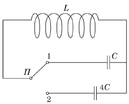 Ідеальний коливальний контур містить котушку індуктивності і два конденсатори, електроємність яких й За допомогою перемикача П можна приєднати до котушки кожен конденсатор окремо (див. рисунок). Як зміниться частота власних коливань у контурі, якщо перевести перемикач з положення у положення ?