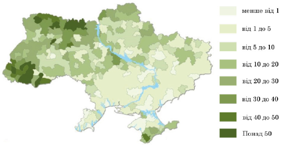 «На півночі й заході України більша, ніж на півдні й сході, частка (%)...