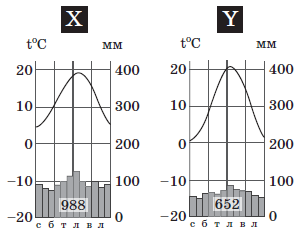 На рисунку зображено кліматодіаграми для двох населених пунктів – Х та Y, розміщених в Європі на одній широті й висоті над рівнем моря. Пункт Y знаходиться східніше пункту Х, тому що в пункті Y