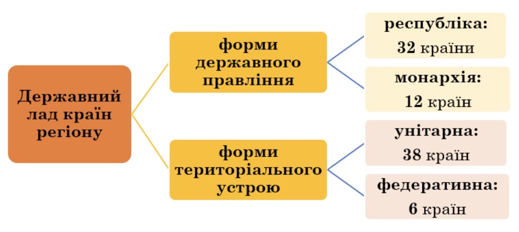 Позначте регіон світу, державний лад країн якого відображено на схемі.