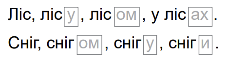 Прочитайте слова. Покажіть одне одному частину слова, яка змінюється. Спишіть слова, позначивши частину, яка змінюється.
