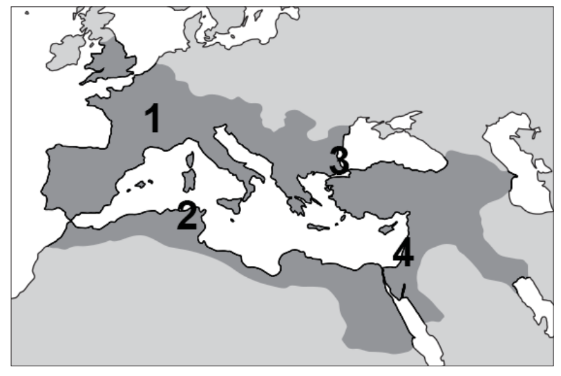 На картосхемі зображено територію Римської імперії і пронумеровано (1-4) певні історико-географічні області, які в різний час стали частиною «Раx Romana».