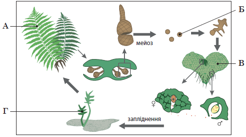 Якою буквою на схемі життєвого циклу папоротей позначено гаметофіт?