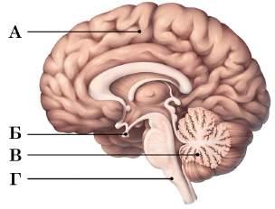 Відділ головного мозку, який містить центри захисних рефлексів (кашель, чихання тощо), на рисунку позначено буквою