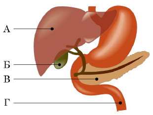 Якою буквою на рисунку позначено жовчний міхур?