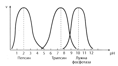На рисунку наведено графіки залежності швидкості ферментативної реакції (v) від рН середовища.
