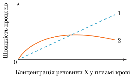 На рисунку зображено залежність у нирці швидкості фільтрації (1) i реабсорбції (2) речовини Х від її концентрації в плазмі крові.