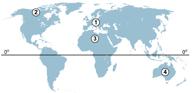На карті цифрами (1-4) позначено місця мешкання тварин.