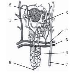 Реабсорбція відбувається в складниках нефрону, які позначено цифрами