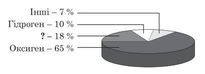 Проаналізуйте діаграму, на якій відображено масові частки (%) хімічних елементів в організмі людини. Укажіть назву хімічного елемента, пропущену в підписі до діаграми.