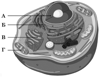 Розгляньте рисунок тваринної клітини, на якому буквами позначено її складники. Який складник зображено ПОМИЛКОВО?