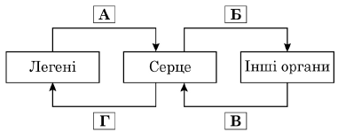 На схемі відображено напрямок руху крові на різних ділянках кровообігу в організмі людини й деяких тварин.