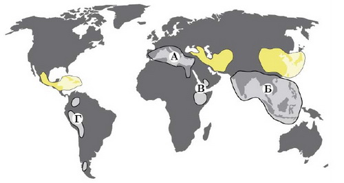На рисунку зображено центри різноманітності та походження культурних рослин. Морква, буряк, маслини походять з одного із чотирьох центрів, позначених літерами. Якою літерою позначено центр, з якого походять зазначені рослини?
