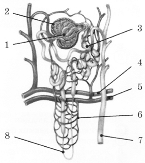 Реабсорбція відбувається в складових нефрону, які позначено цифрами