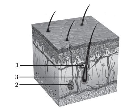 На рисунку зображено будову шкіри людини. Виберіть правильний варіант підписів до нього.