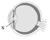 Який елемент ока, що з віком стає більш плоским, втрачає еластичність і зазвичай спричинює далекозорість, позначено на рисунку буквою Х?