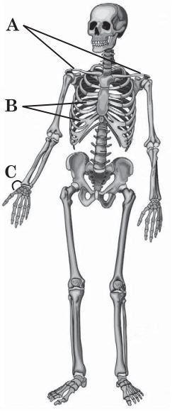 Порівняйте елементи скелета людини, що позначені на рисунку літерами А, В, С, з відповідними частинами скелета тварин.