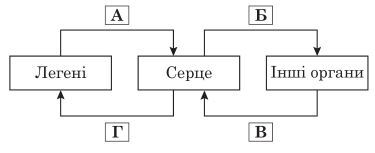 На схемі відображено напрямок руху крові на різних ділянках кровообігу в організмі людини й деяких тварин.