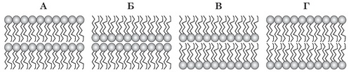 Якою літерою позначено схематичне зображення розташування двох шарів фосфоліпідів у біологічних мембранах?