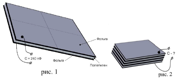 Радіоаматор виготовив плоский конденсатор з однакових квадратних шматків фольги й поліетиленової плівки (рис. 1). Електрична ємність саморобного конденсатора дорівнює