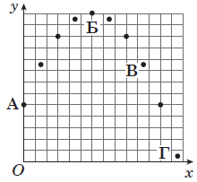На рисунку схематично зображено у двовимірній системі координат фрагмент результату стробоскопічної зйомки руху кульки, яку кинули з точки A під кутом до горизонту. У якій із позначених точок значення потенціальної енергії кульки було максимальним?