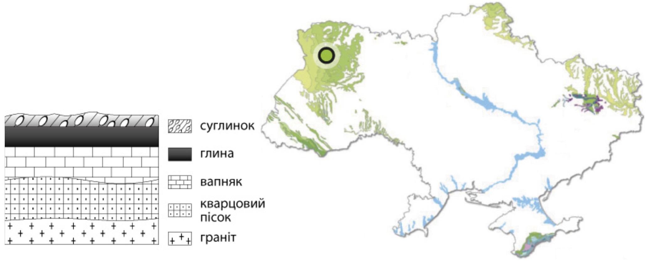 Розгляньте відображену на рисунку схему залягання пластів гірських порід від поверхні до глибини 100 м у позначеному на карті районі. Визначте наслідки розроблення пласта глини кар’єрним способом.