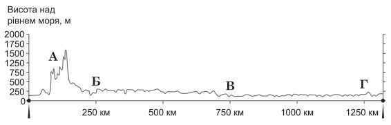 На профілі поверхні території України, побудованому вздовж умовної лінії, що з'єднує крайні західну й східну точки країни, визначте місцезнаходження долини річки Дніпра.