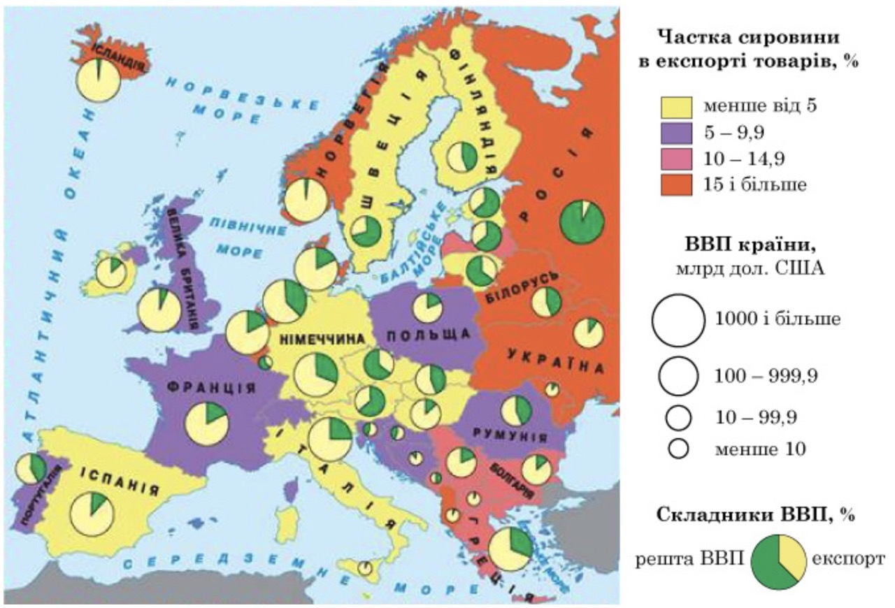 Проаналізуйте картограму, на якій відображено показники експорту товарів у країнах Європи. Щоб наблизити структуру експорту товарів України до структури експорту країн Євросоюзу, потрібно в Україні збільшити частку
