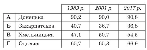 Проаналізуйте наведені в таблиці показники рівня урбанізації в областях України в 1989-2017 рр. Визначте область, у якій частка (96) міського населення зростала найшвидше.