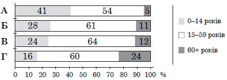 На діаграмах відображено віковий склад населення Європи, Азії, Африки й Латинської Америки. Укажіть діаграму, характерну для Європи.