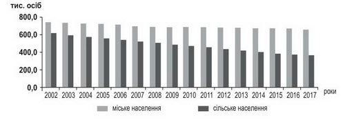 Проаналізуйте відображену на діаграмі динаміку чисельності міського й сільського населення Чернігівської області та зробіть висновок.
