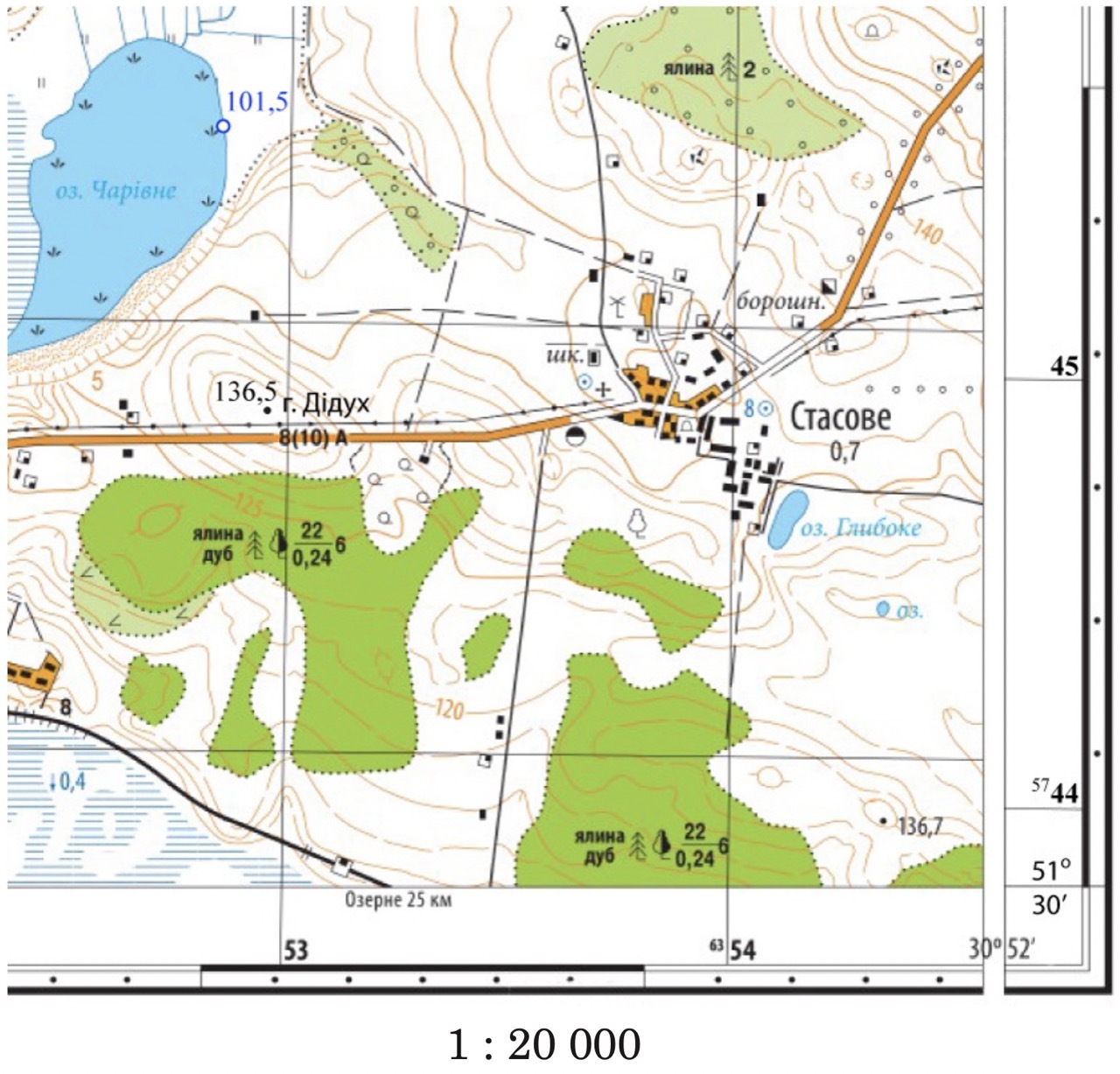 Визначте відстань (у метрах) на місцевості від школи в селі Стасове до ялинника, якщо на карті довжина відрізка дороги становить 3,5 см.