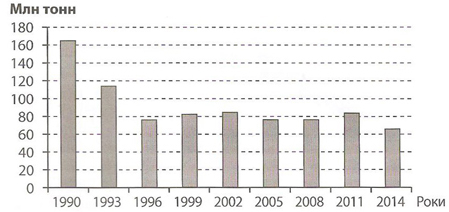 На діаграмі відображено динаміку видобутку одного з видів паливних ресурсів в Україні. Про який вид палива йдеться?