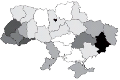 Чим вища інтенсивність кольору на картограмі, тим більшим в областях України є значення