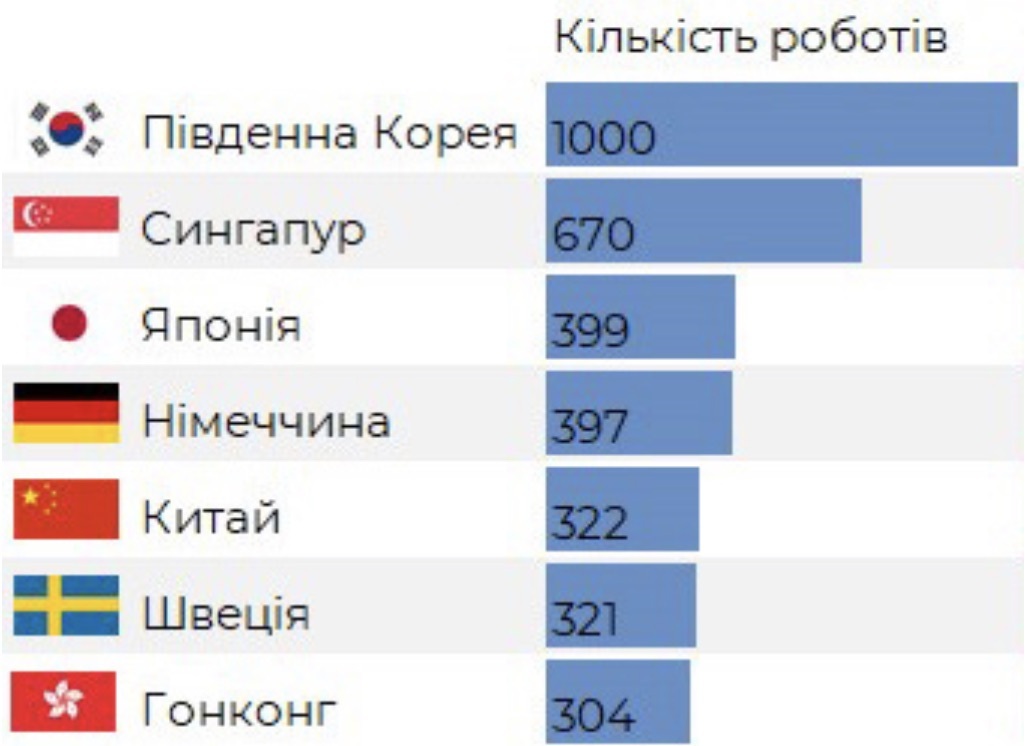 Проаналізуйте діаграму, на якій відображено рейтинг шести країн з найбільш автоматизованим виробництвом. Кількість роботів на 10000 робітників найбільша в тих країна, де спостерігають збільшення