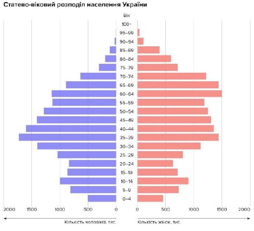 Проаналізуйте статево-вікову піраміду України (2024 р.). Позначте відображені на ній демографічні процеси, характерні для періоду 2010–2024 рр.