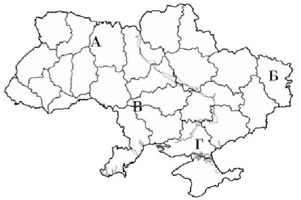 Якою буквою позначено на картосхемі регіон України, що спеціалізується на зерновому господарстві, вирощуванні цукрових буряків, соняшника, свинарстві, молочно-м’ясному скотарстві?