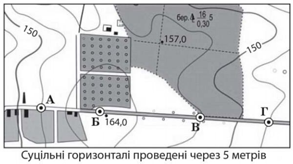 Оцініть рельєф місцевості, зображеної на фрагменті карти. У якій точці можна спостерігати за рухом транспорту на всьому відрізку шосе, позначеному на карті?