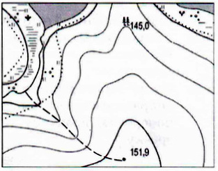 За наведеною картою визначте найбільш ефективний спосіб збереження родючості земельних угідь уздовж стежки, що спускається з вершини горба до річки.