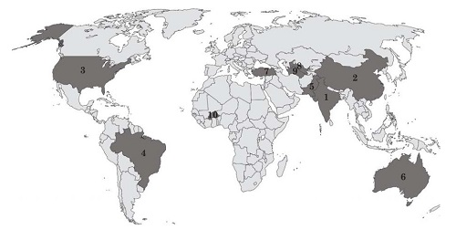 Укажіть сільськогосподарську культуру, країни-лідери за вирощуванням якої позначено темним кольором на картосхемі.