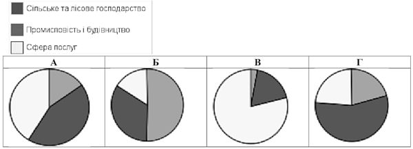 Ураховуючи особливості галузевої структури (за відсотком зайнятих), укажіть діаграму, яка характеризує країну, що розвивається.