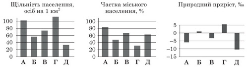 Доберіть для кожної області України відповідні показники щільності населення, рівня урбанізації та природного приросту населення, що відображені на діаграмах (три різні характеристики населення однієї області позначено на трьох діаграмах однаковою буквою).