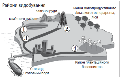 На рисунку зображено модель просторової організації господарства умовної країни з низьким рівнем економічного розвитку. Спроєктуйте ефективне розміщення кожного підприємства у віддалених від столиці районах для подолання їхньої відсталості й сировинної спеціалізації.