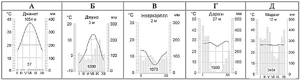 Установіть відповідність між типом клімату та кліматограмою