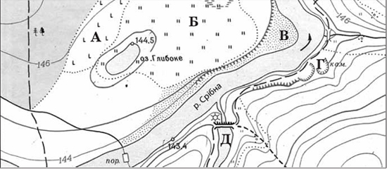 Установіть відповідність між видом діяльності та найбільш придатною для нього ділянкою, що позначена буквою на фрагменті топографічної карти.