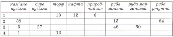 Доберіть з таблиці для кожної області сукупність показників, що відображають її частки в запасах корисних копалин в Україні.