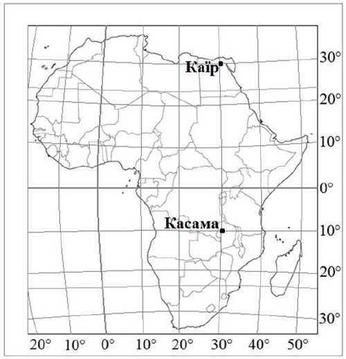 Обчисліть, на скільки хвилин місцевий час у місті Касама випереджає місцевий час на Гринвіцькому меридіані.