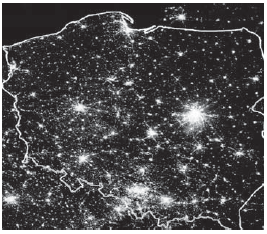 На космічному знімку Польщі в нічний час видно міські агломерації (показник освітленості території відповідає рівню концентрації населення й економічної діяльності). За знімком визначте особливості системи розселення в Польщі.