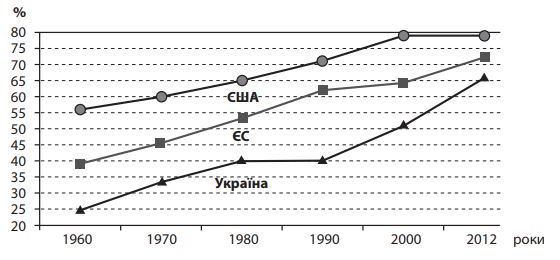 Проаналізуйте графіки зміни частки зайнятих (%) у сфері послуг України, США та країн Європейського Союзу (1960-2012 рр.) і зробіть висновки.