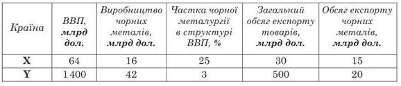 За наведеною в таблиці інформацією доберіть правильні твердження щодо оцінки ролі чорної металургії в економіці двох умовних країн Х та У.